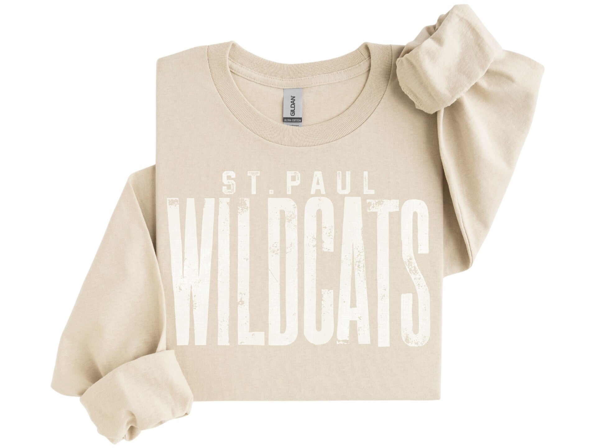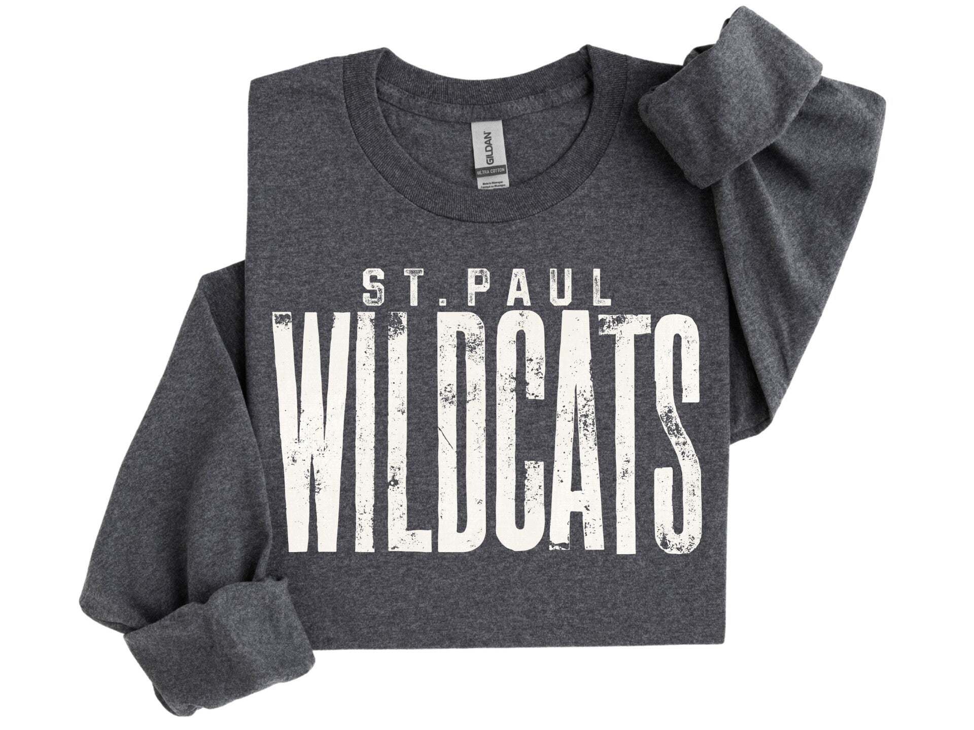 A classic design featuring distressed white block lettering for a timeless, worn-in look. Available in short sleeve, long sleeve, crewneck, and hoodie styles. Short and long sleeve shirts are Bella Canvas brand. Crewneck sweatshirts are Gildan or Jerzees brand, depending on availability.