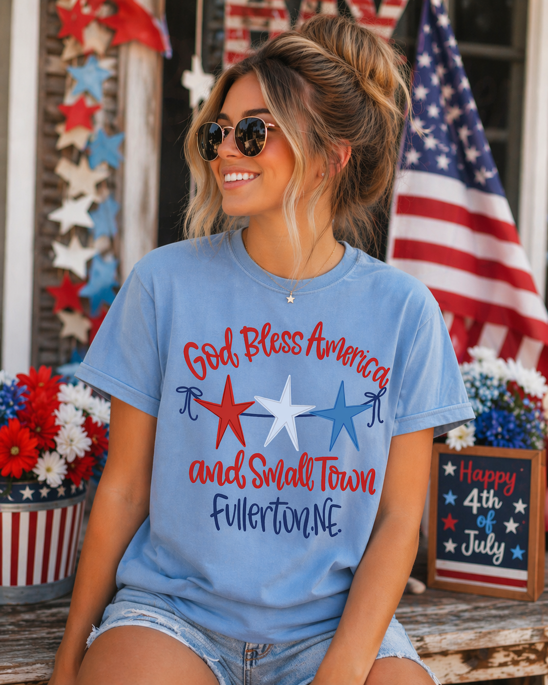 Celebrate small-town pride and patriotic spirit with this bold, feel-good design. Featuring “God Bless America and Small Town Fullerton, NE” in a mix of script and hand-drawn lettering, accented with red, white, and blue stars, this tee is made for summer days, parades, and backyard celebrations.